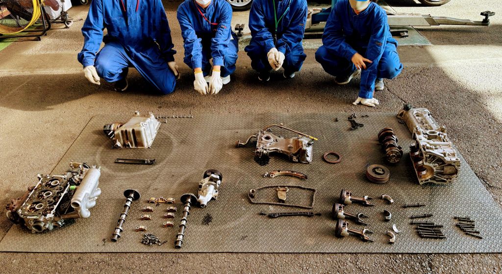 初めは慣れない工具の扱いに戸惑いながらネジを回すことにも苦労していましたが、作業を進めるうちに少しずつ感覚をつかみ、写真のようにエンジンをしっかり分解することができました。